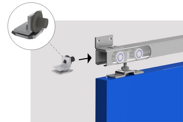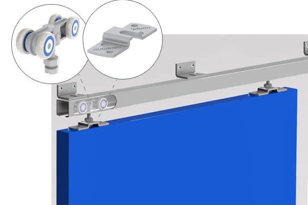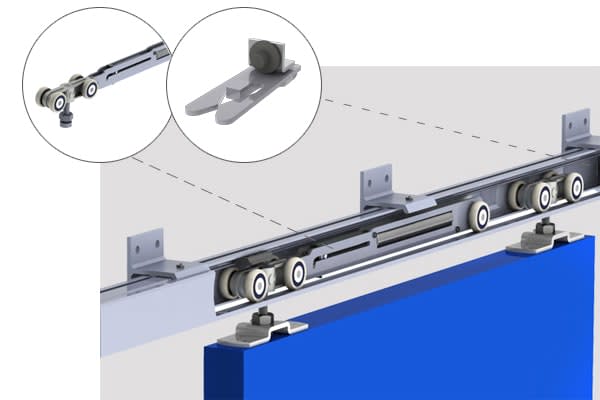 Nylonhjul anbefales for innendørs bruk og stålhjul for utendørs bruk. Oppheng monteres 2 stk/dør. Festeplater brukes til å montere rullevognene på dør. Tre, aluminium og komposittdører henges med topp- eller sidefesteplater.